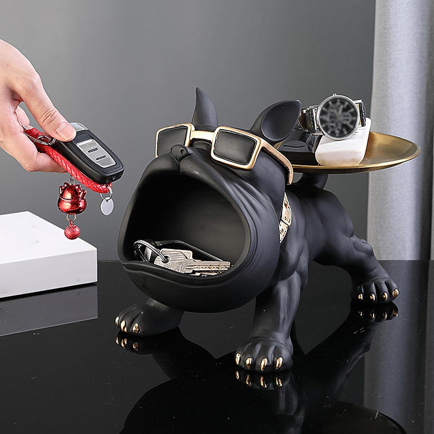 Wonderful Bulldog Showpiece for world living room and living room table decoration; Resin Cool Dog Sculpture Bulldog Storage used for Used as a debris container or candy box, which can store mobile phones, keys, Wallets, glasses, remote controls, etc. Whether on the porch, living room, office, study, Juice, chocolate, Snacks, coffee shop desk, or dining table, it’s a gorgeous decoration