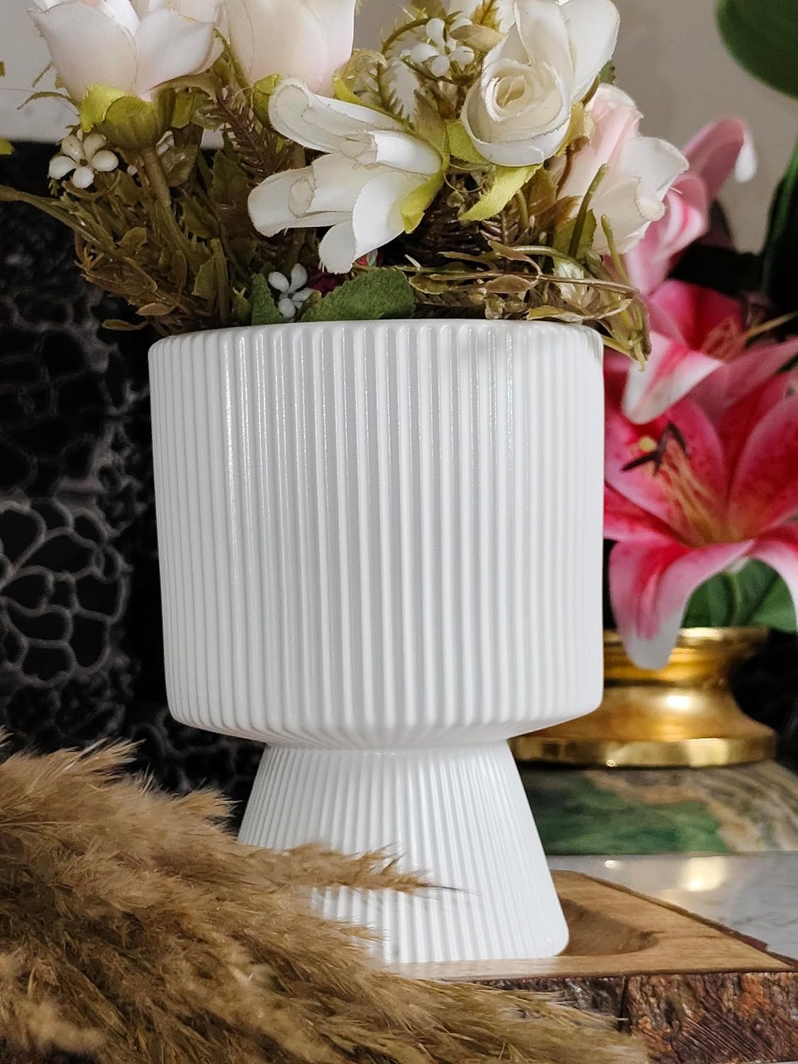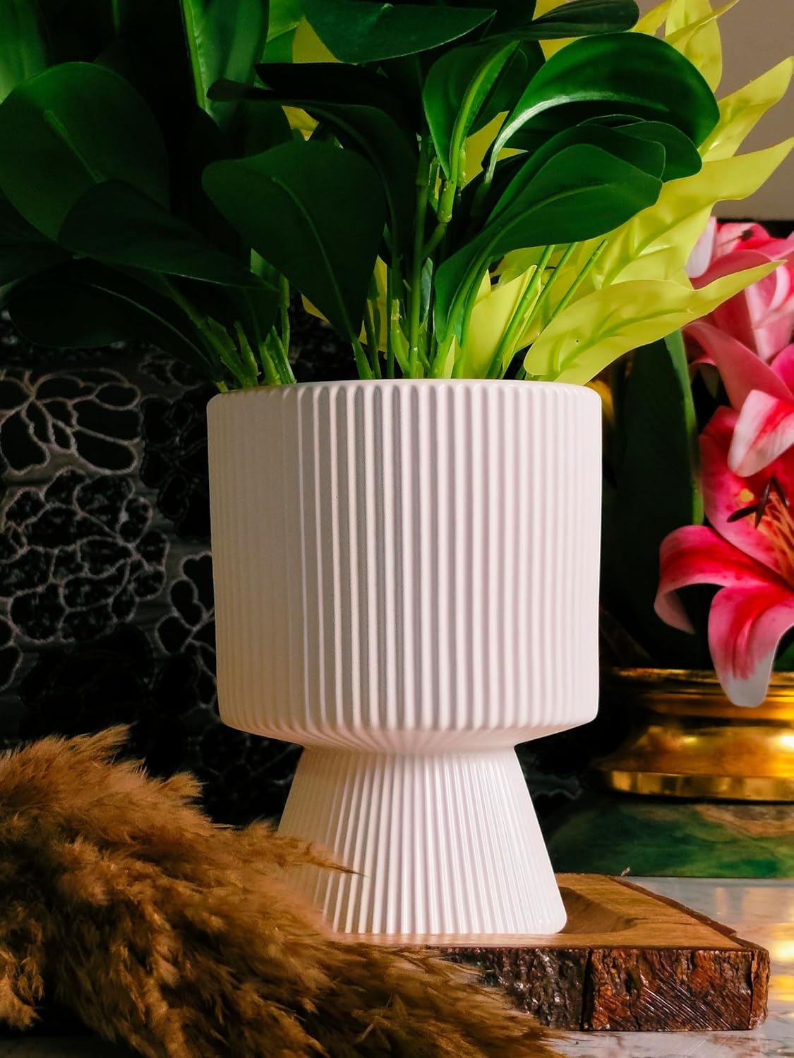 About this item Decorative: Creative Stripe design Style is lovely and adorable for decoration, home indoor and outdoor Planters can be applied to home, office balcony garden etc Dimensions- L-13 x W-13 x H-16 CM Texture :- Ceramic, Handcrafted Comes with a WATER DRAINAGE HOLE at the bottom that allows water to flow through soil so live plants stay happy and healthy High temperature fired ceramic, handmade and glazed; Good quality clay to ensure durability and longevity. Suitable for Indian climate › See more product details