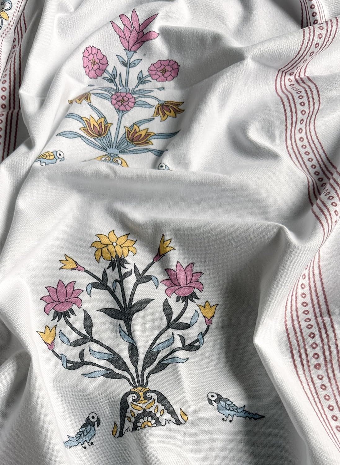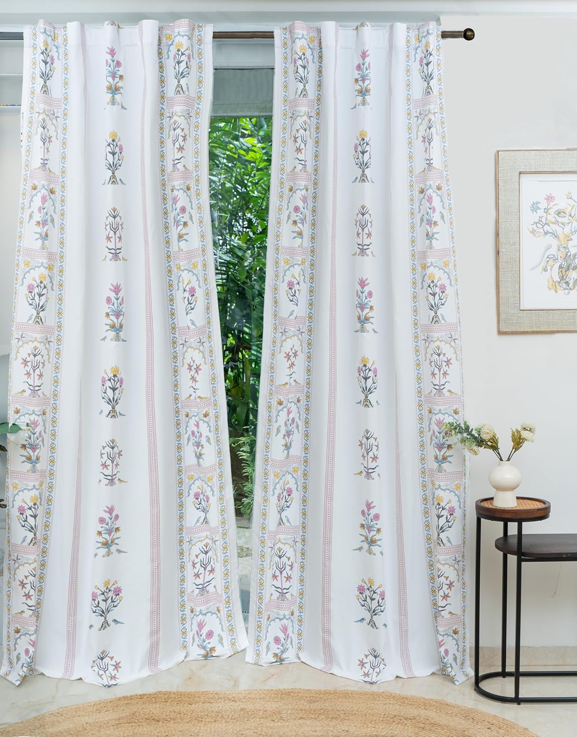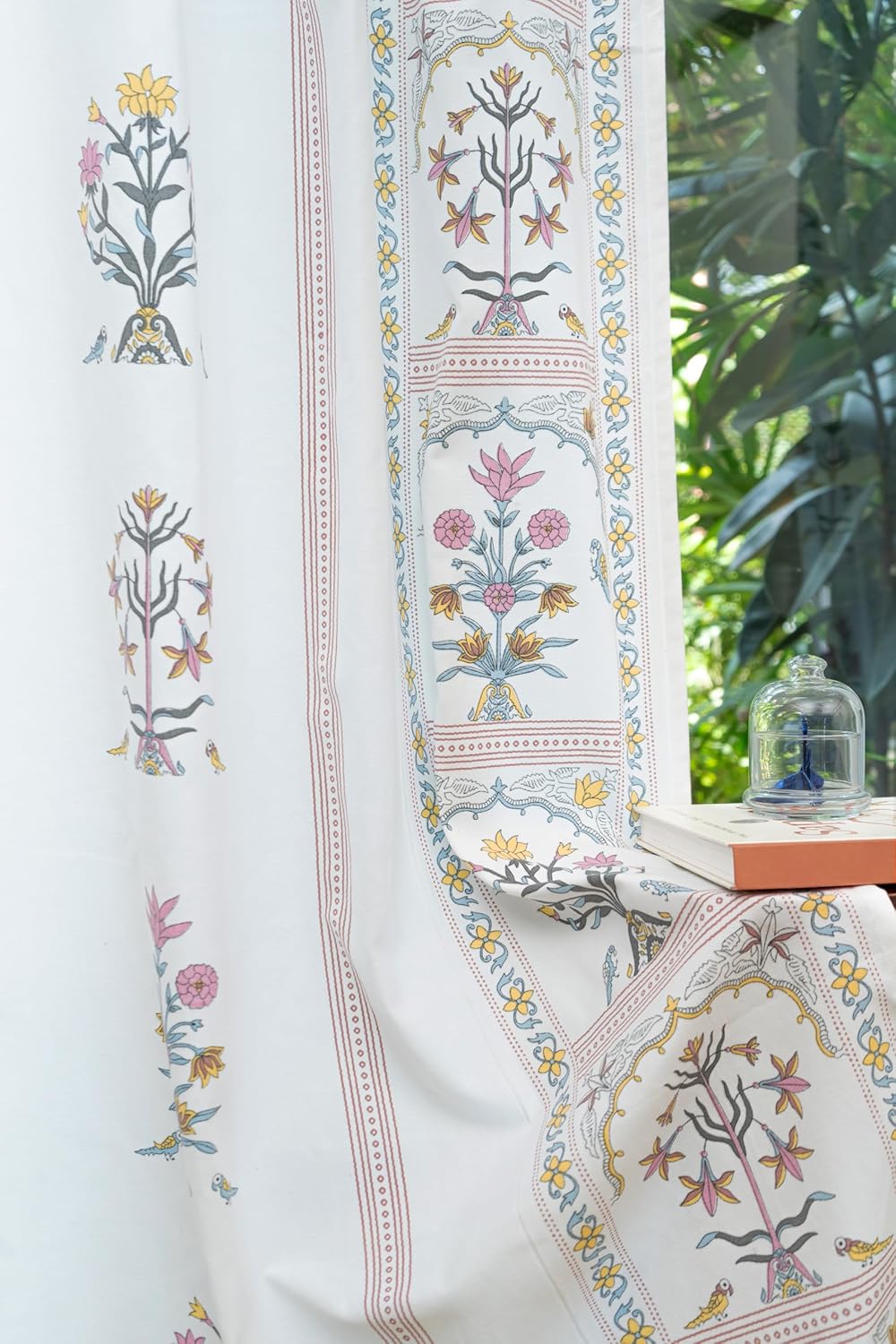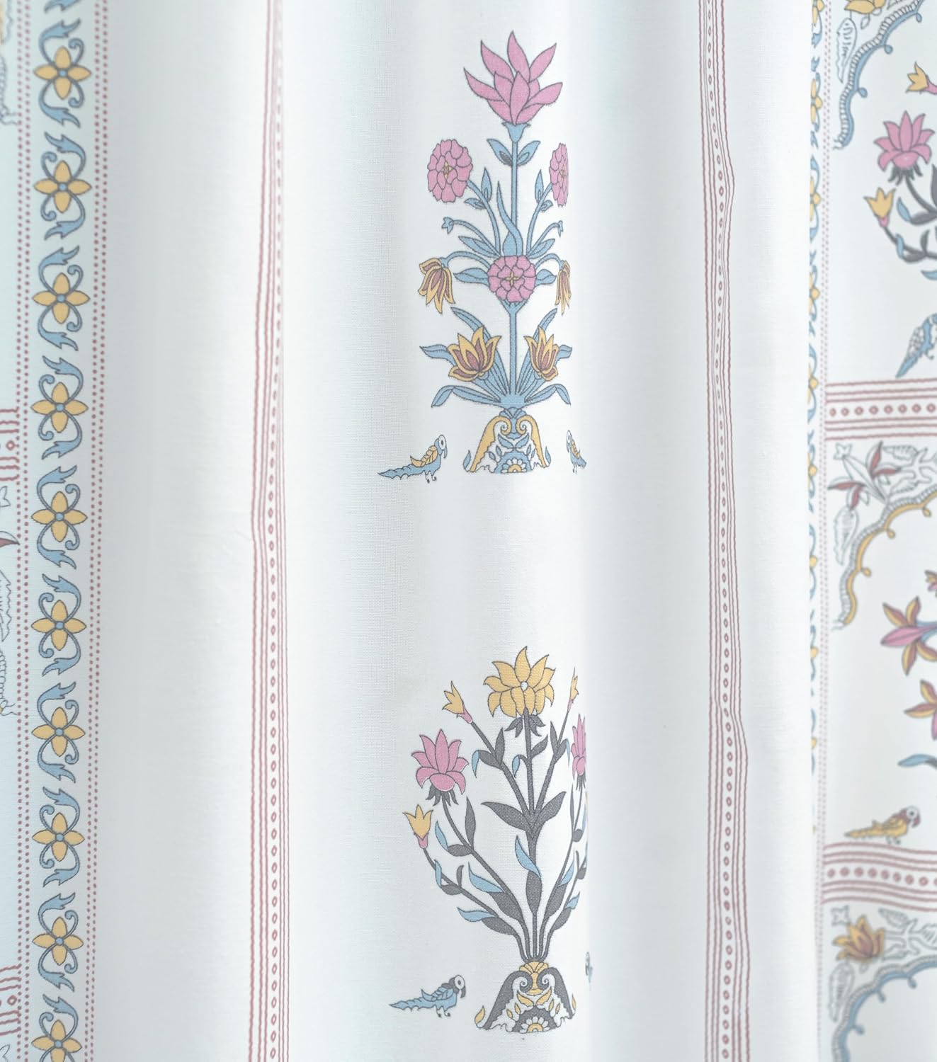The print is fresh and beautiful,the quality of the fabric is nice..third time I m buying these curtains..every print is sober and beautiful..thanks amezon and thanks to tranquebar curtain co 🙂