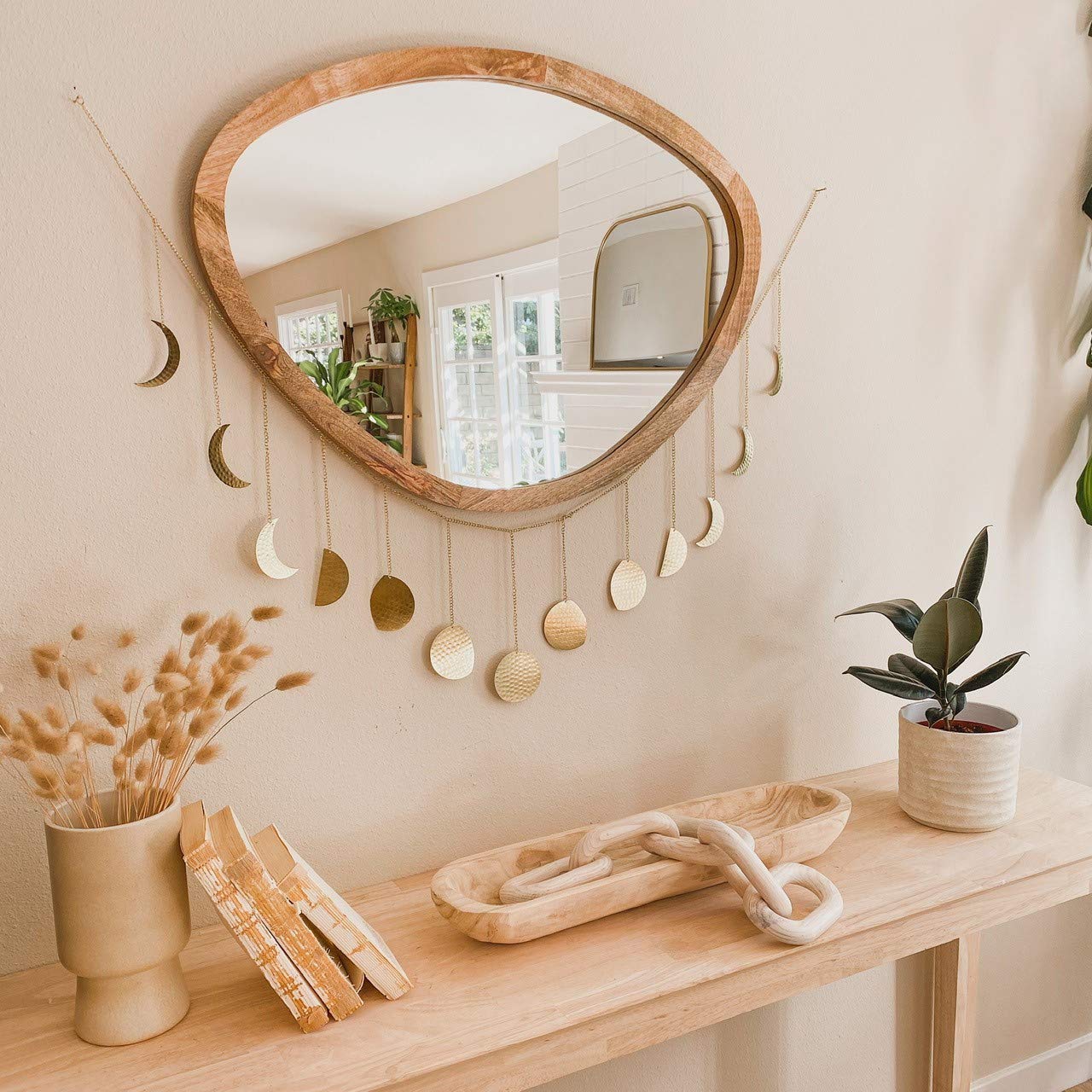 About this item [PERFECT DECOR] Inspired by the whole changing process of the “Lunar Phase.” This decorative wall art creates comfort and natural life for any space, as it glistens. It will bring a mystical and eclectic touch to any room or add it to your existing decor! Mirror is NOT included. [PERFECT SIZE (LARGER THAN OTHER PRODUCTS)] This wall hanging is 55″ long which is a perfect size to hang above headboard or use it as an accent decor for your house. It is the perfect size to go over a queen/king size bed. This trendy wall hanging comes with hooks and expansion tubes, easy to install and hang onto any wall. [PERFECT GIFT] Give That Special Someone The PERFECT present! Perfect for Birthdays, Christmas, Valentine’s Day, Anniversaries, Parties, stocking stuffers, baby showers, or random gifts for him or her. It comes in a gift box with a cotton satchel bag. [100% SATISFACTION MONEY BACK GUARANTEE] Each moon is handmade and crafted by artisans in India and may contain slight variations in the hammer markings, shape and size which add to their rustic charm and uniqueness. If you are not 100% happy with the product, we will issue a refund. Please feel free to ask any questions! [SIZE] 55″ long, each moon’s diameter is 3″. It is the perfect size to go over a queen/king size bed. › See more product details