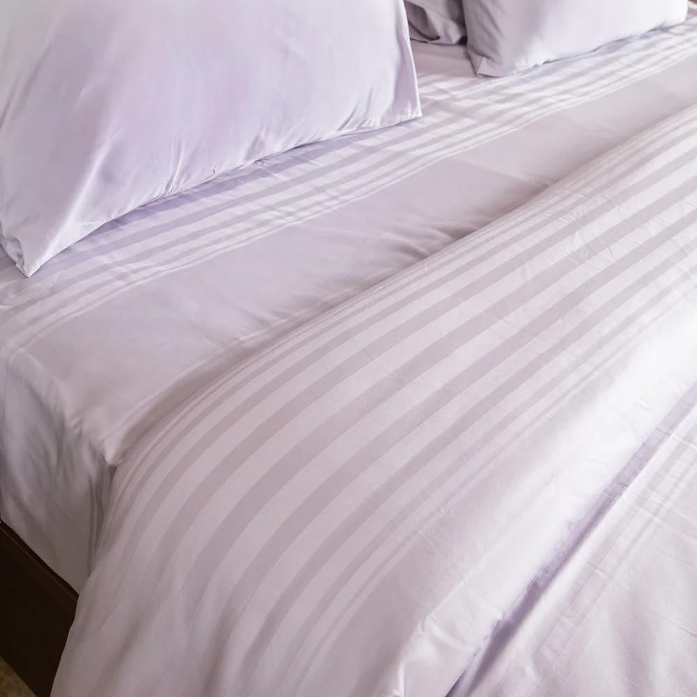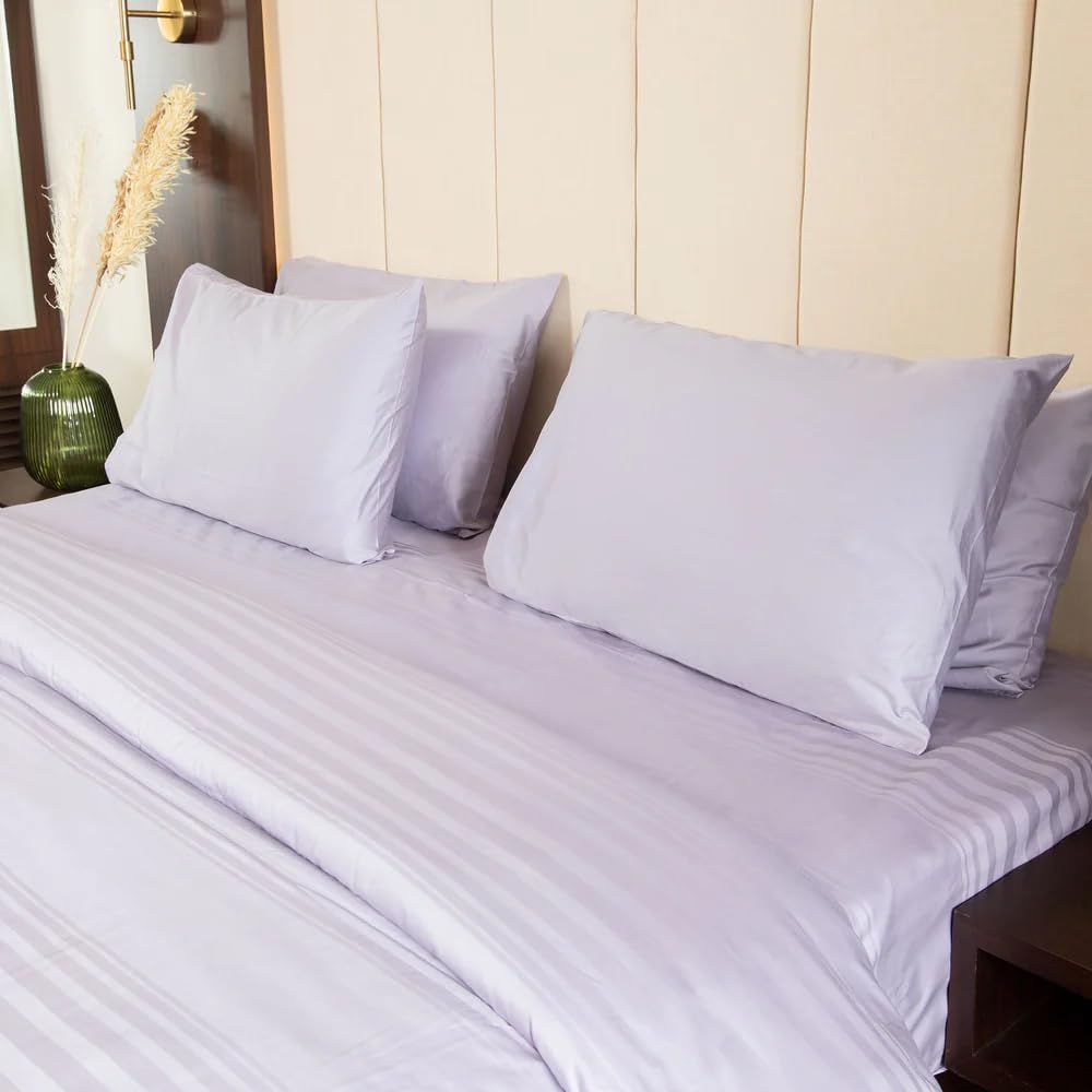 300 Thread Count & 100% Cotton: Designed with a luxurious 300 thread count and 100% cotton fabric for a soft, breathable, and durable finish, ensuring premium comfort. Lavender Aura Color: The soothing Lavender Aura color adds a calming and elegant touch to your bedroom decor. Premium Horizontal Stripes Design: Features a modern variegated horizontal stripes…