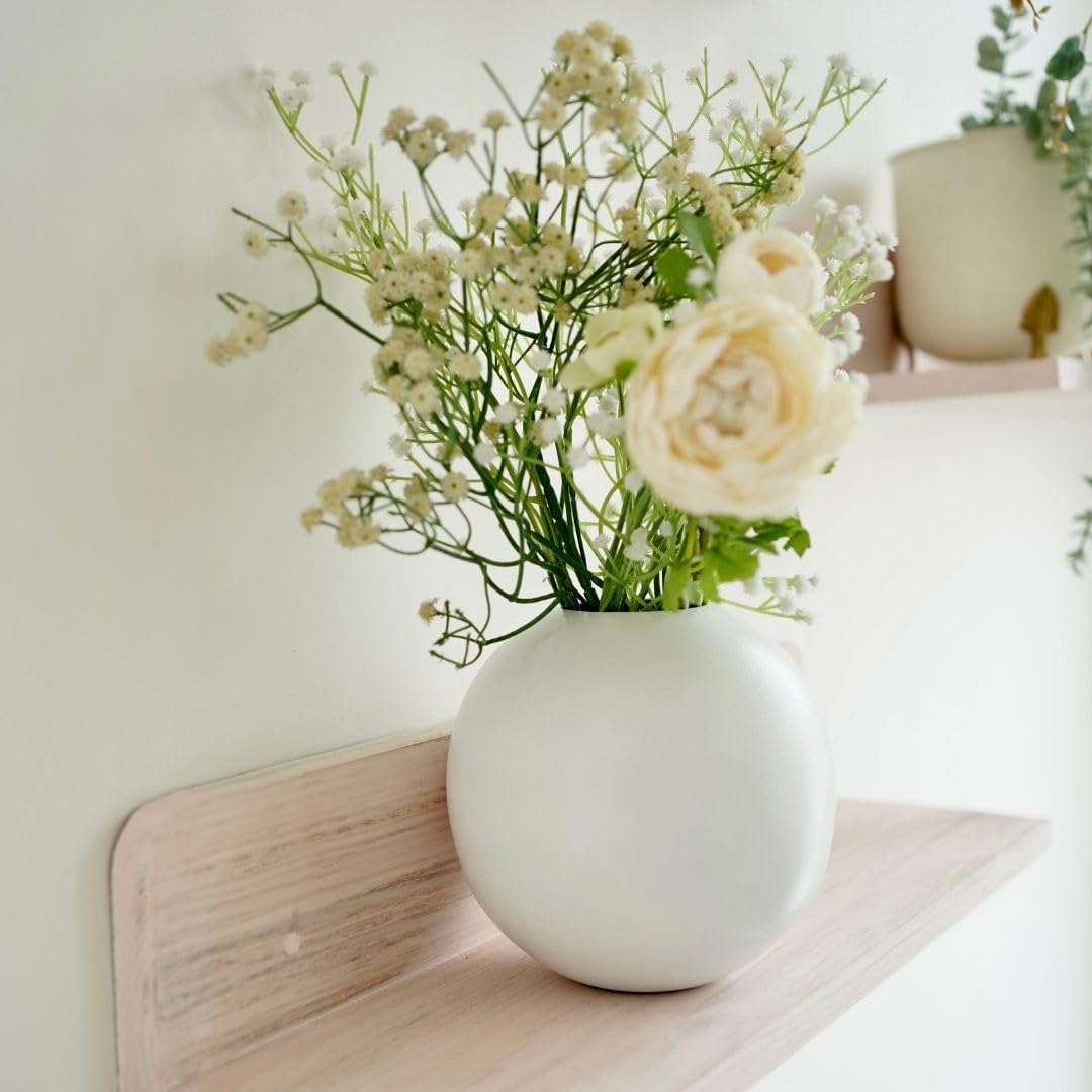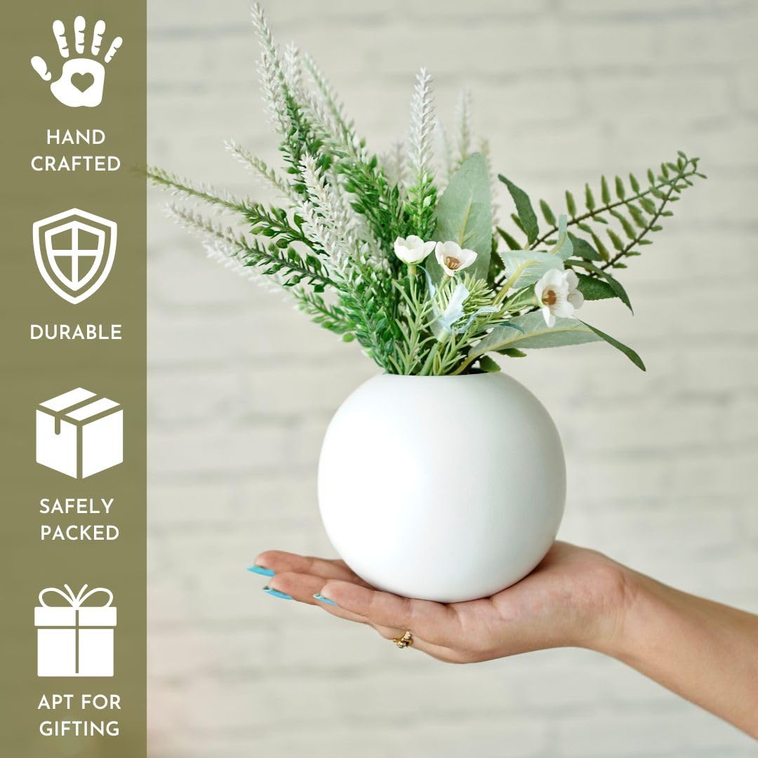 About this item Material & Shape: This metal White ball vase is made of high quality iron, which makes it long-lasting, sturdy and durable for indoor use. For better maintenance, you can use dry cloth to clean the dust. The vases come with soft pad at the bottom to prevent surface from scratches. This is a handmade product made in India. Note: Slight variation may exist in product due to handcrafting process. Versatile Display Options: This White ball vase set featuring a shiny mirrored finish is perfect for displaying your favorite flowers, foliage, or even standing alone as a captivating dcor piece. Beautiful metal vase, provides a luxurious and warm look for any house or office. It effortlessly complements both fresh and artificial arrangements. Ideal choice for Home Decor & Gifting: This stylish, elegant vase from Behoma are an ideal gifting choice for a greenery lover. A statement-making flower vase, its modern design can match with any kind of home decor. These vases for flowers are eye-catching and add sophistication wherever you place them. Ideal choice of Diwali gifts, Christmas gifts and housewarming gifts, mother?s day, corporate gifting. Size: The dimension of the vase: L – 11.5 CM, W – 11.5 CM, H ? 10.5 CM. Packaging: The vase comes neatly and securely packed in a brown corrugated box to avoid any transit damages. Ideal for gifting also. Note: Flowers & decorations are not included in this item. › See more product details