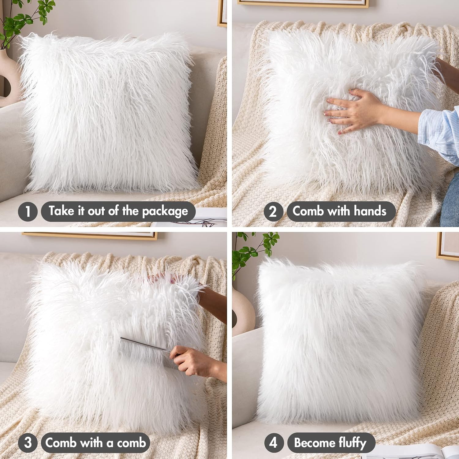 These pillow covers were just what I needed to make my couch pop! I had bought a white faux fur fug and felt these pillows would compliment the look nicely and I was right!To get the same look as my rug, I threw them in the dryer for 10 min then used a wig comb to get rid of the ratty look and voila it’s almost like I bought the pillows and rug as a set. There was quite a bit of shedding during the process but not much since. I included side by side pics of the process.I’m in love with my living room even more now thanks to these pillow covers; again these are just covers you still need pillows inserts.