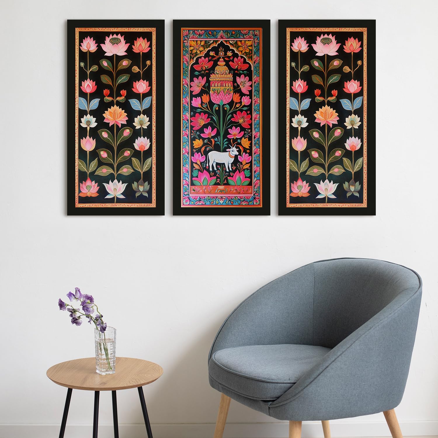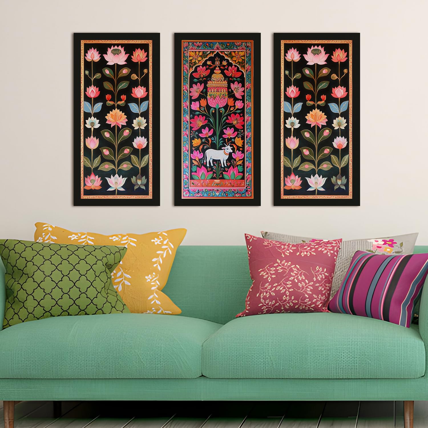 These Pichwai paintings are absolutely breathtaking! The colors are vibrant, and the intricate details bring an authentic charm to my living room. The set of three canvas-wrapped, framed artworks creates a cohesive look, and the size (12×24 inches per frame) is perfect for a medium to large wall space. The quality of the canvas and frame is excellent, making it feel like a premium product. Highly recommended for anyone looking to add a touch of Indian heritage and elegance to their home