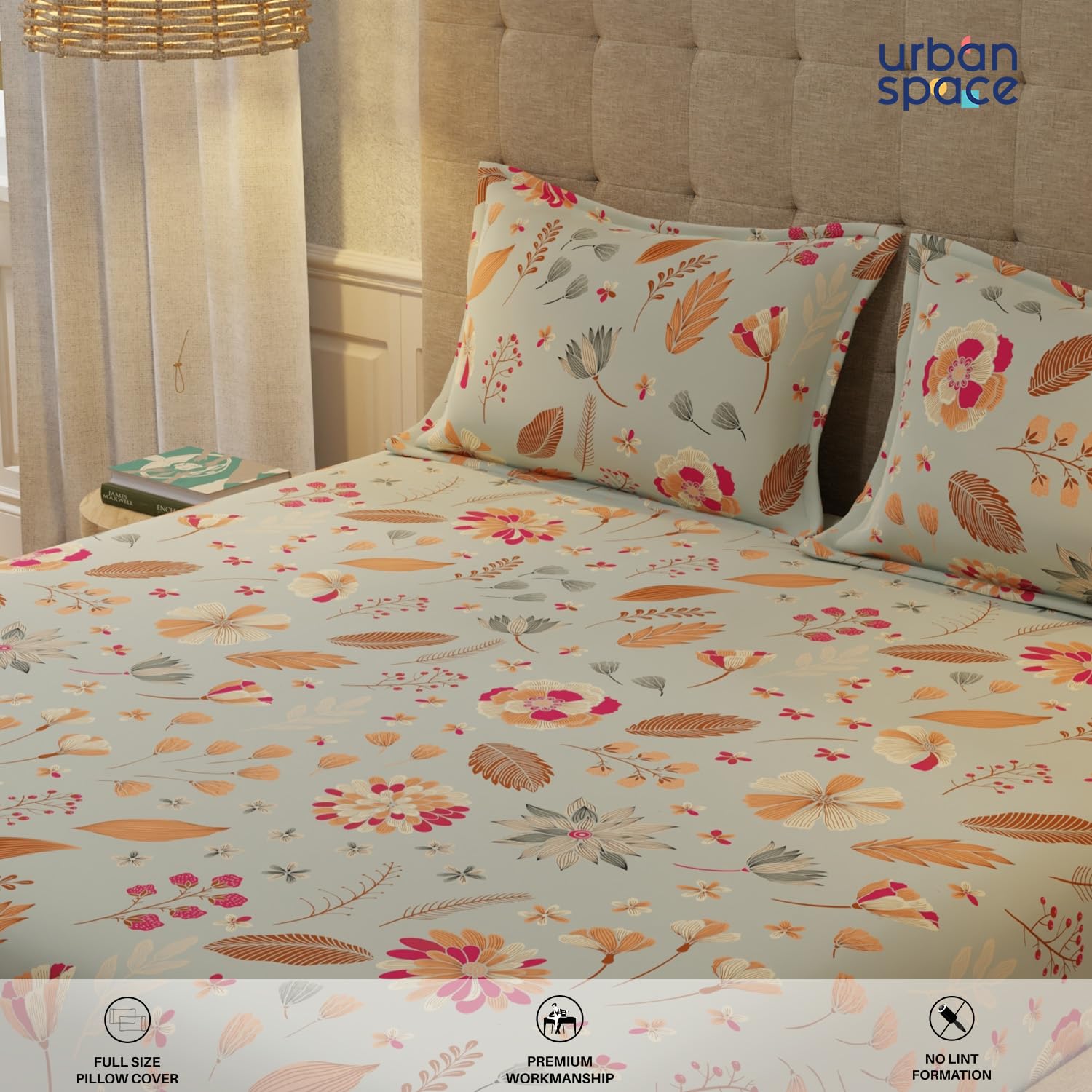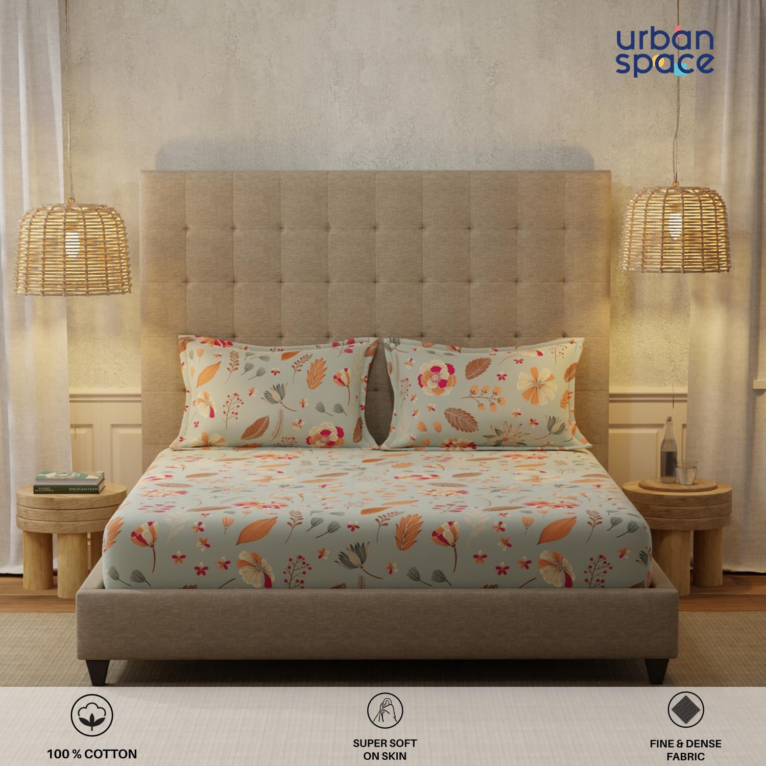About this item Luxurious 100% Cotton Fabric: Our bedsheet for king bed is crafted from premium long-staple cotton, providing a soft and soothing touch that’s perfect for sensitive skin, ensuring your comfort throughout the night. Available in Multiple Sizes: Whether you need a king size bedsheet cotton or a double size bedsheet cotton, our range has you covered. Choose from Single, Double, and King sizes, with options featuring elastic fitted for a perfectly snug fit on your mattress. Complete Bedding Set: Pack includes 1 Bedsheet + 2 Pillow Cover , ensuring your bedding is beautifully coordinated and inviting. Easy Care & Durable Design: Enjoy sheets that are designed for longevity with features like no color bleeding, minimal lint formation, and low shrinkage primarily in the first wash. For best results, machine wash at low temperatures and wash dark colors separately. Stylish Home Decor & Thoughtful Gift: Elevate your bedroom’s ambiance with our elegantly designed bed sheets, available in vibrant colors and complemented by Urban Space’s AC blankets. An ideal gifting choice for housewarmings, weddings, or anniversaries, these bedsheets offer luxury and practicality under 1500. › See more product details