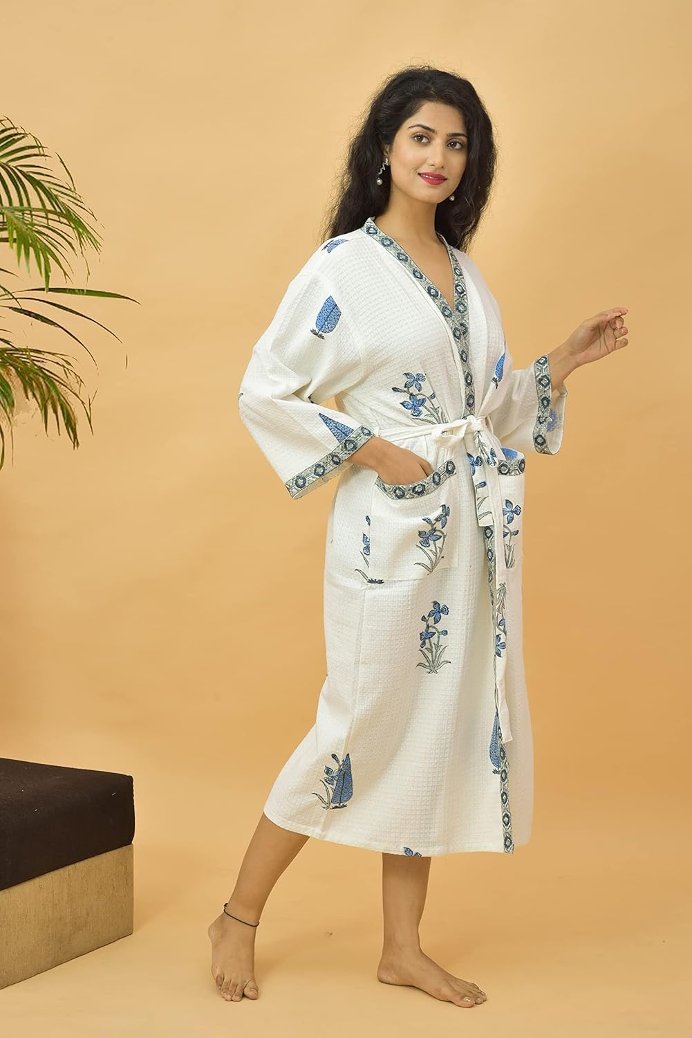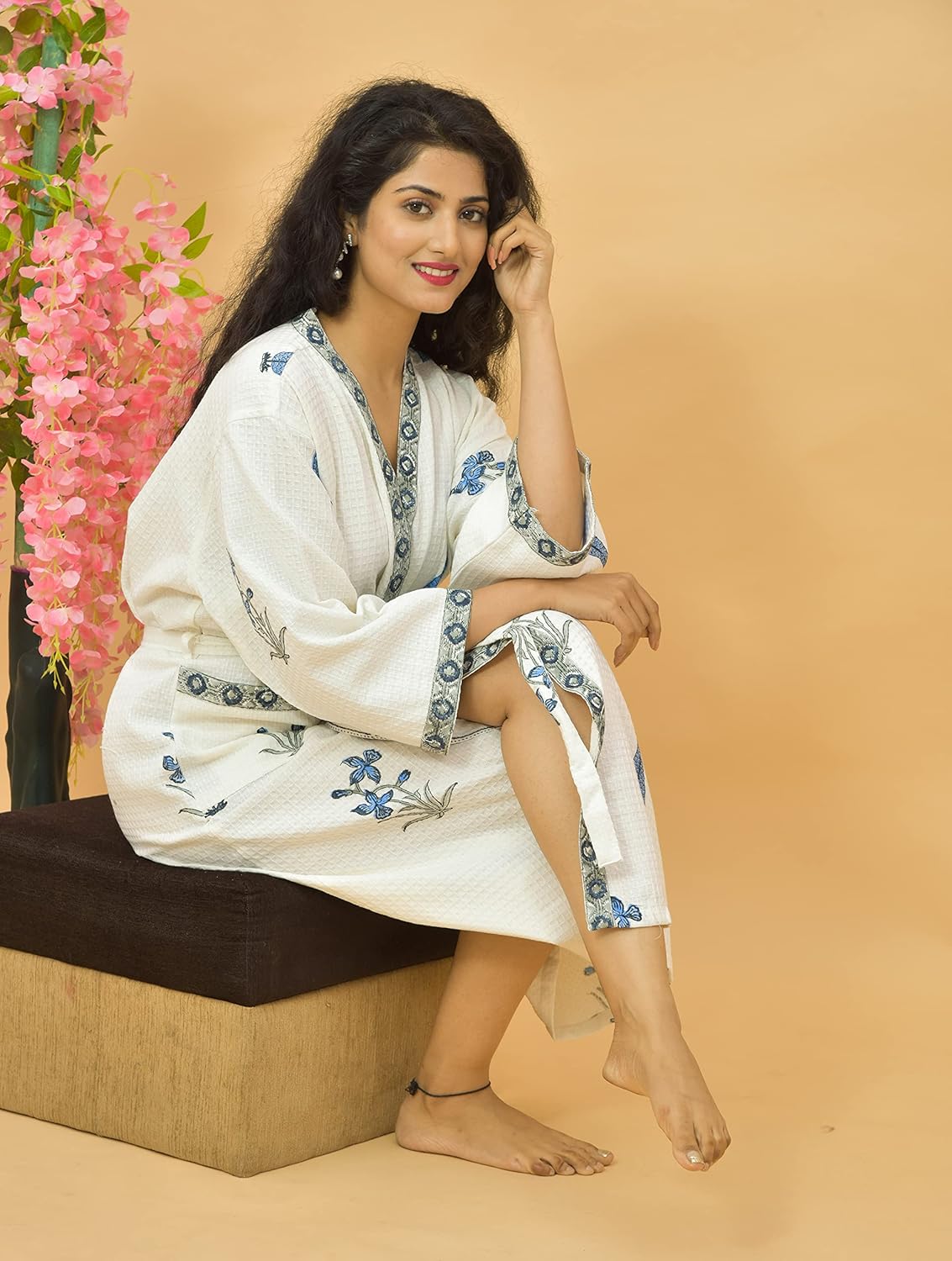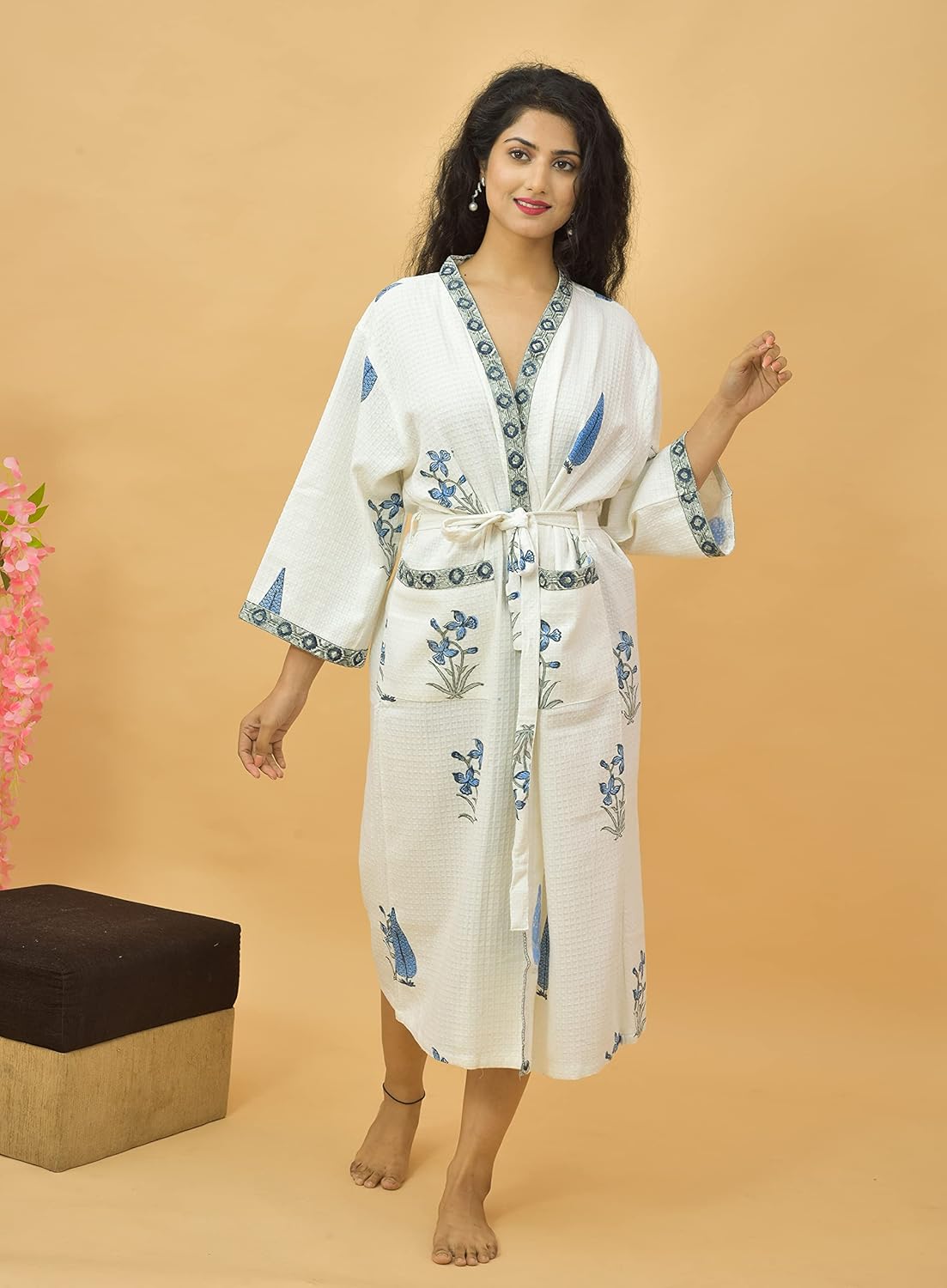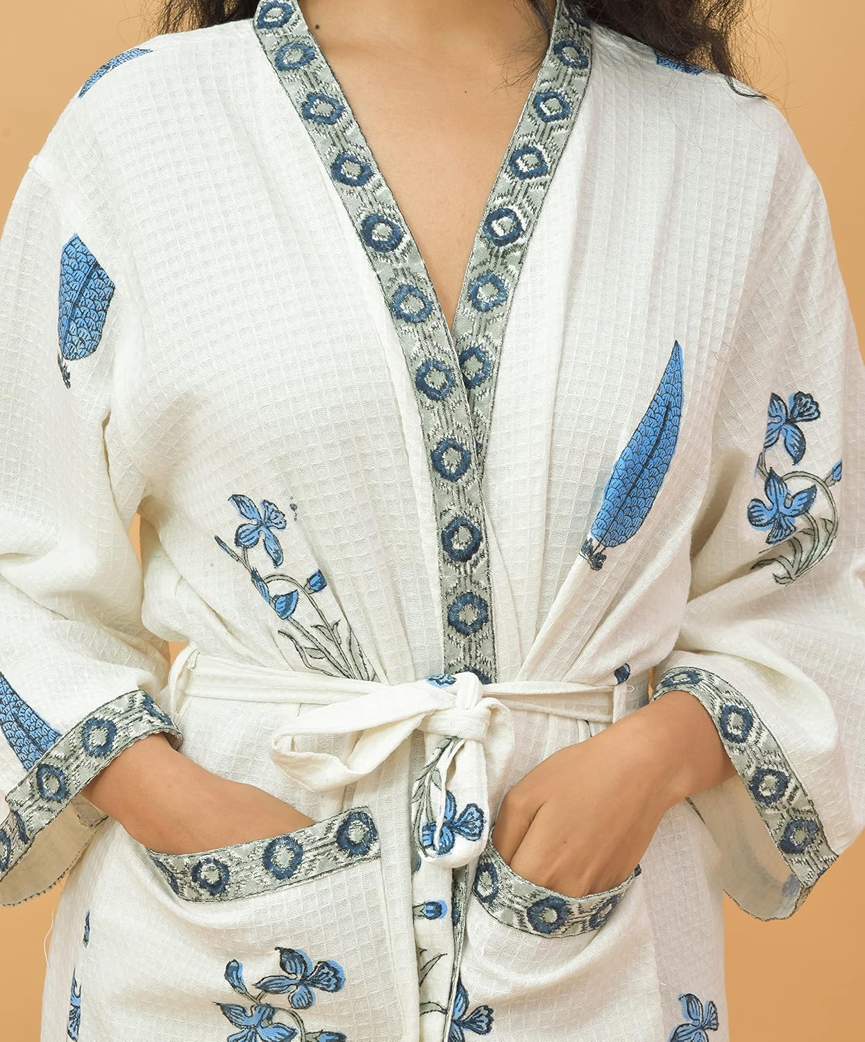 Add a smart look to your loungewear with this traditional lightweight waffle bathrobe. For a relaxing and fresh conclusion to your shower look no further than this beautiful Bathrobe. This is a hand block printed, cotton bathrobe which gives an elegant look. Classic prints with a tie robe.